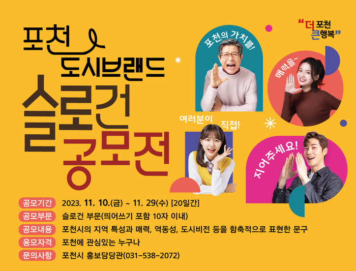 한편, 포천시 도시브랜드 슬로건 공모전과 관련된 자세한 사항은 포천시청 홈페이지(www.pocheon.go.kr) 또는 홍보담당관 홍보기획팀(031-538-2072)에 문의하면 된다.
