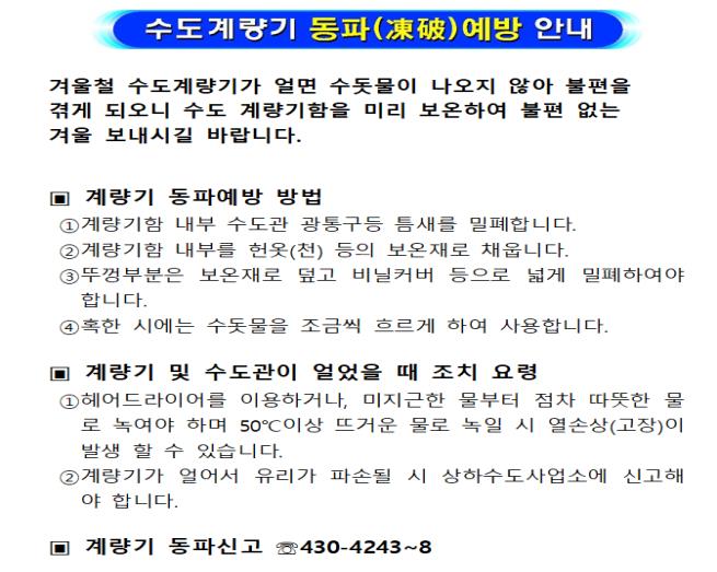 올 겨울이 기습한파 등 평균보다 낮은 기온이 지속될 것이라는 기상청 예보에 따라 예년보다 동파방지에 더욱 각별한 주의가 요구되고 있는 만큼 사전대비가 최우선이며, 집 주변의 수도시설을 사전에 철저히 점검하고 예방할 것을 거듭 당부했다.